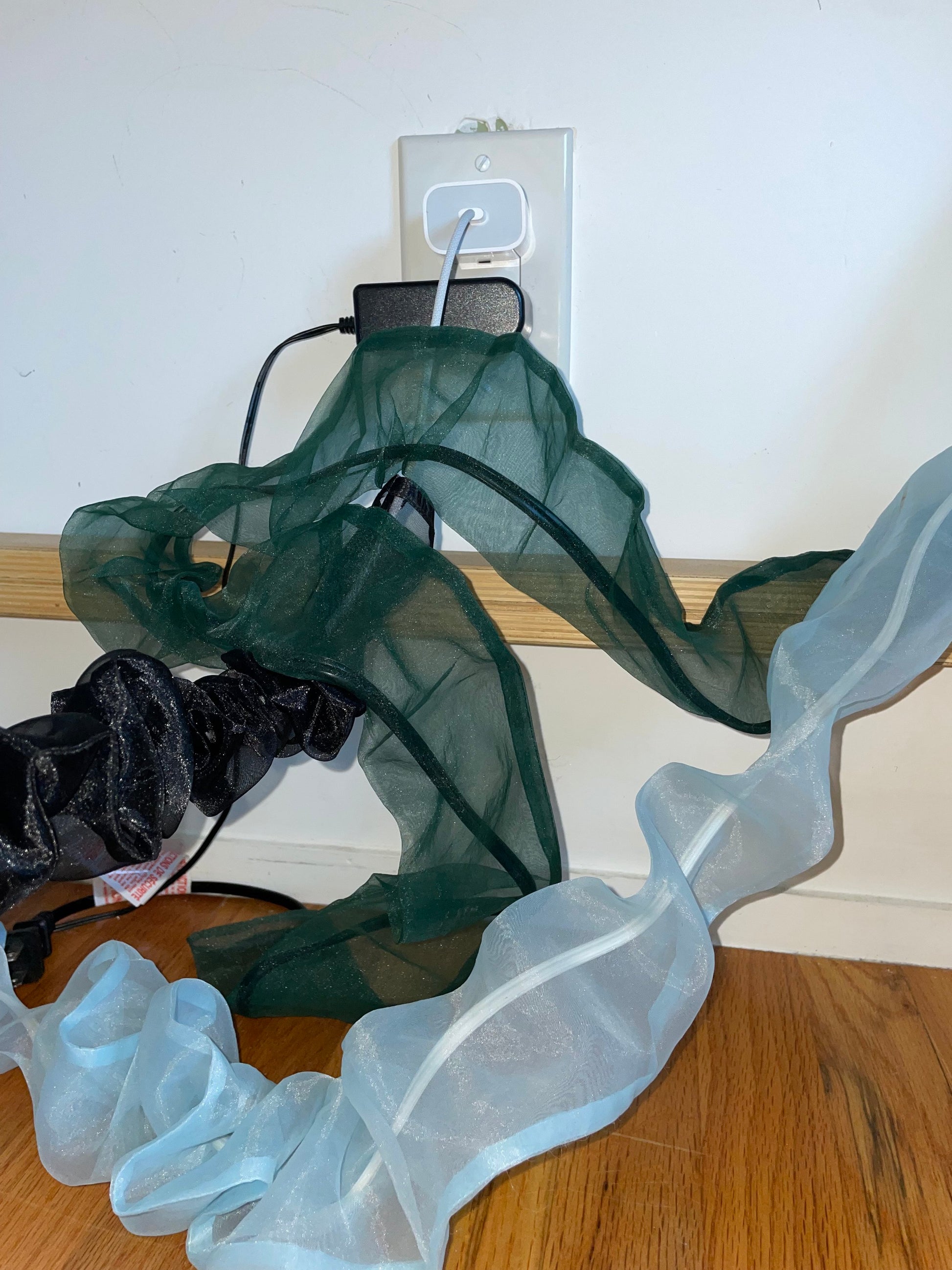 Elevate your home comforts with a beautiful organza cord cover from Iko Iko. Each piece is made in Los Angeles by Kristin Dickson-Okuda from Japanese poly organza, finished with french seams. Use one next to your bed to veil your unsightly charger cable.