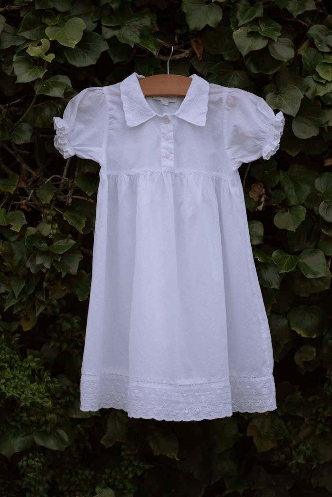 A lovely lightweight cotton nightdress perfect for summer. The puffed short sleeves are elasticated and the broderie anglaise collar opens with three buttons. The skirt is full for comfort and finishes with a beautifully embroidered hem and a band of drawn thread work above.