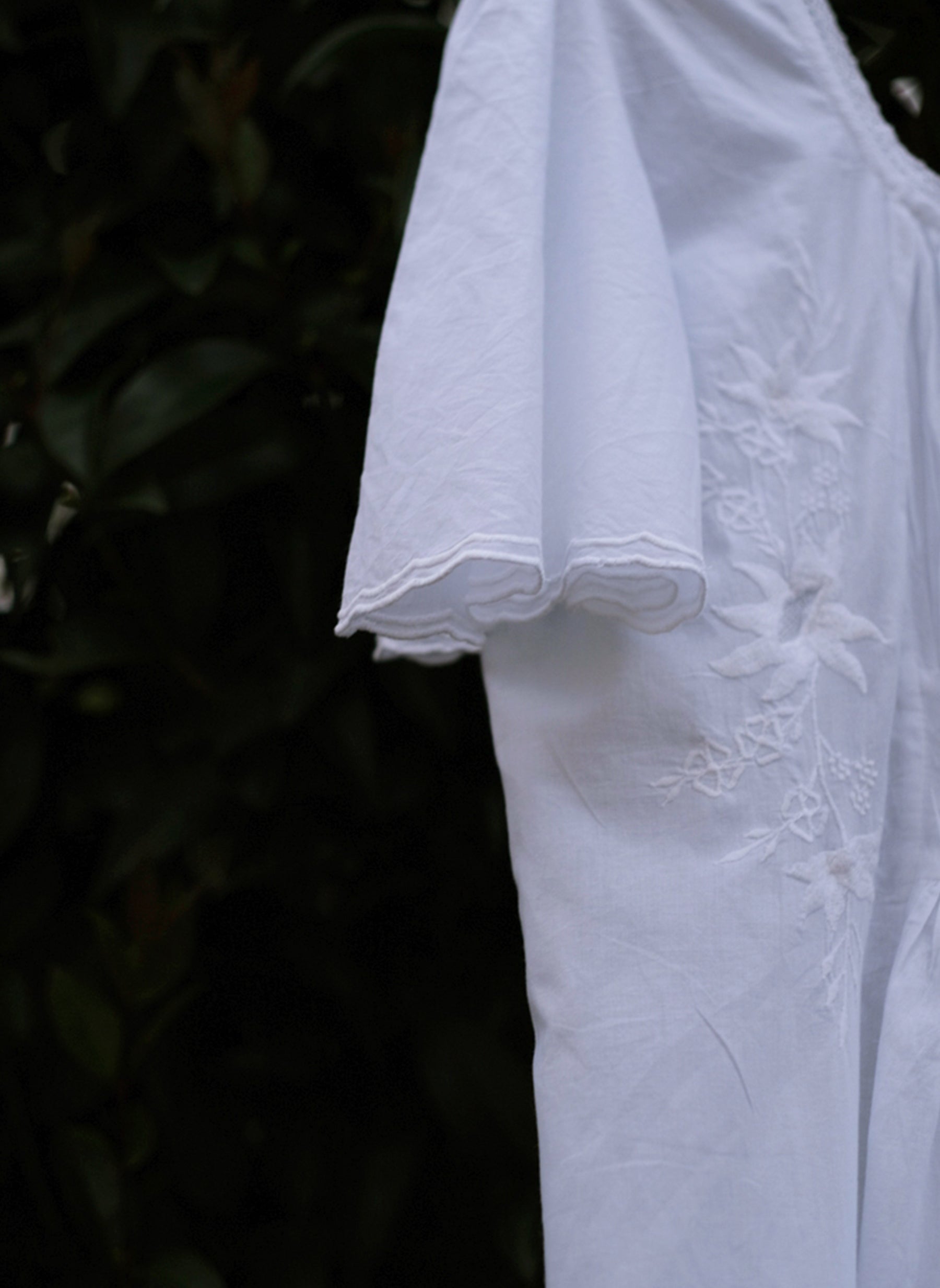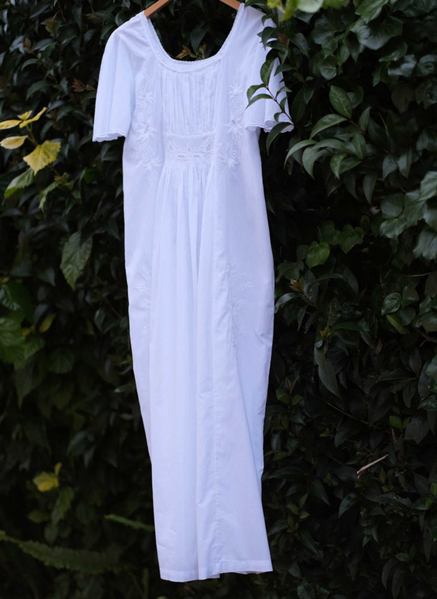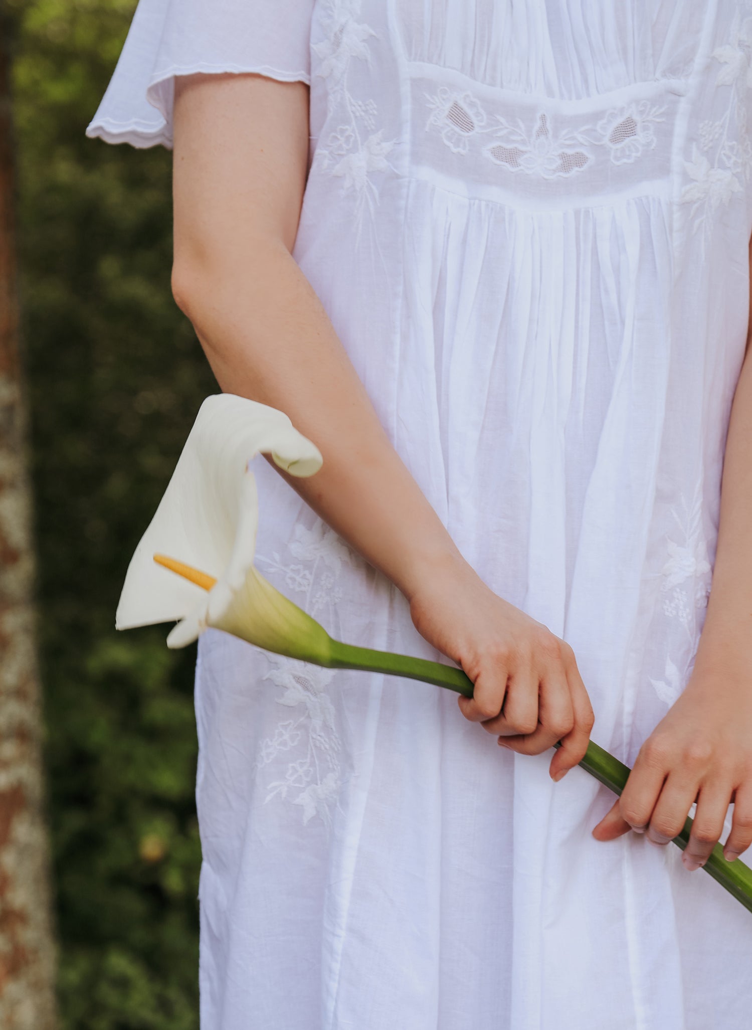 The Daphne is a beautiful full-length cotton nightdress with short flutter sleeves. The front bodice has gathering and elegant white floral embroidery.