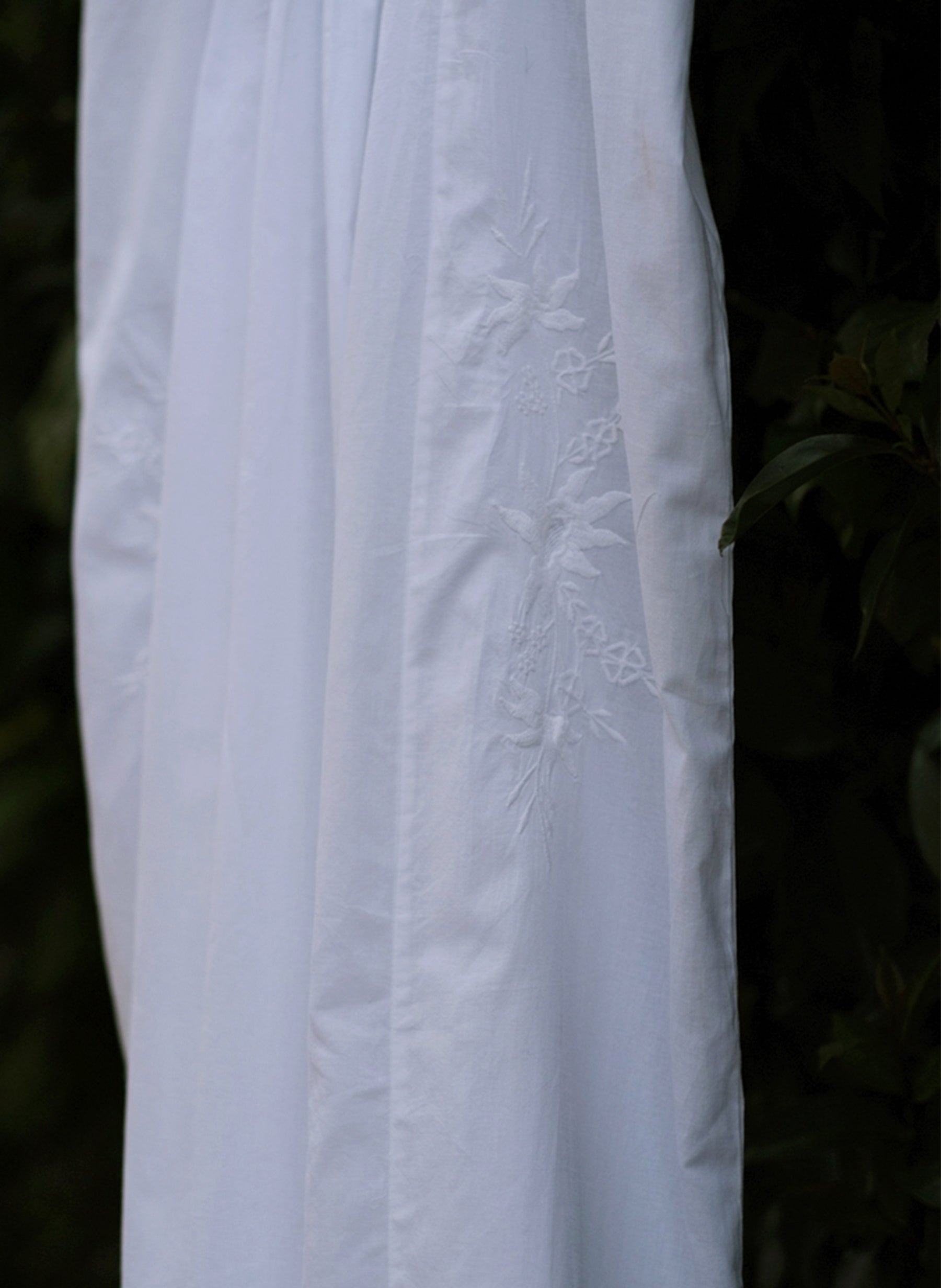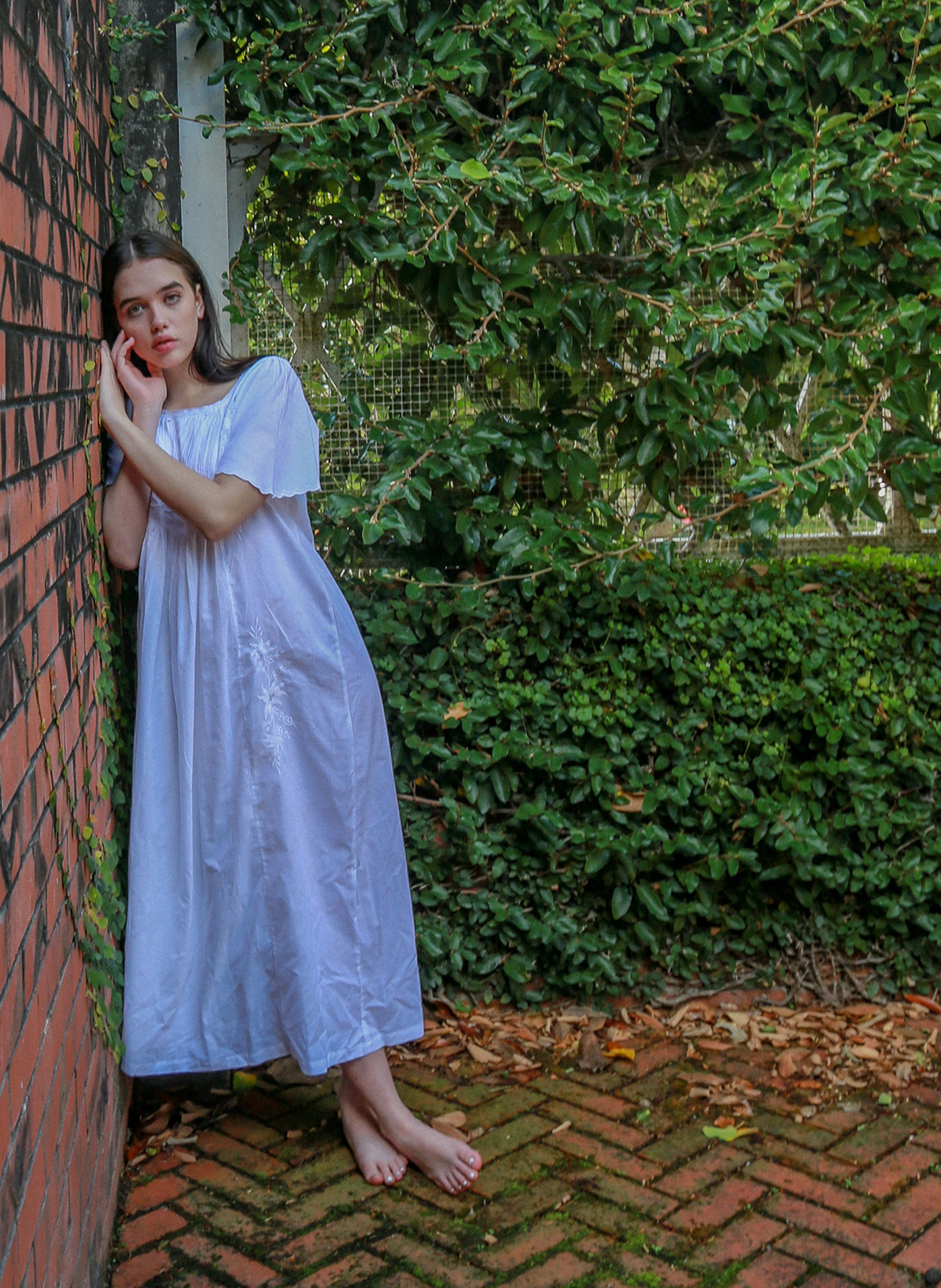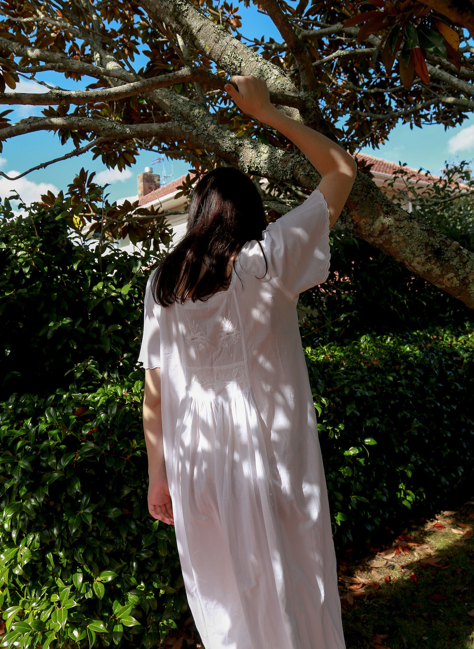 The Daphne is a beautiful full-length cotton nightdress with short flutter sleeves. The front bodice has gathering and elegant white floral embroidery.