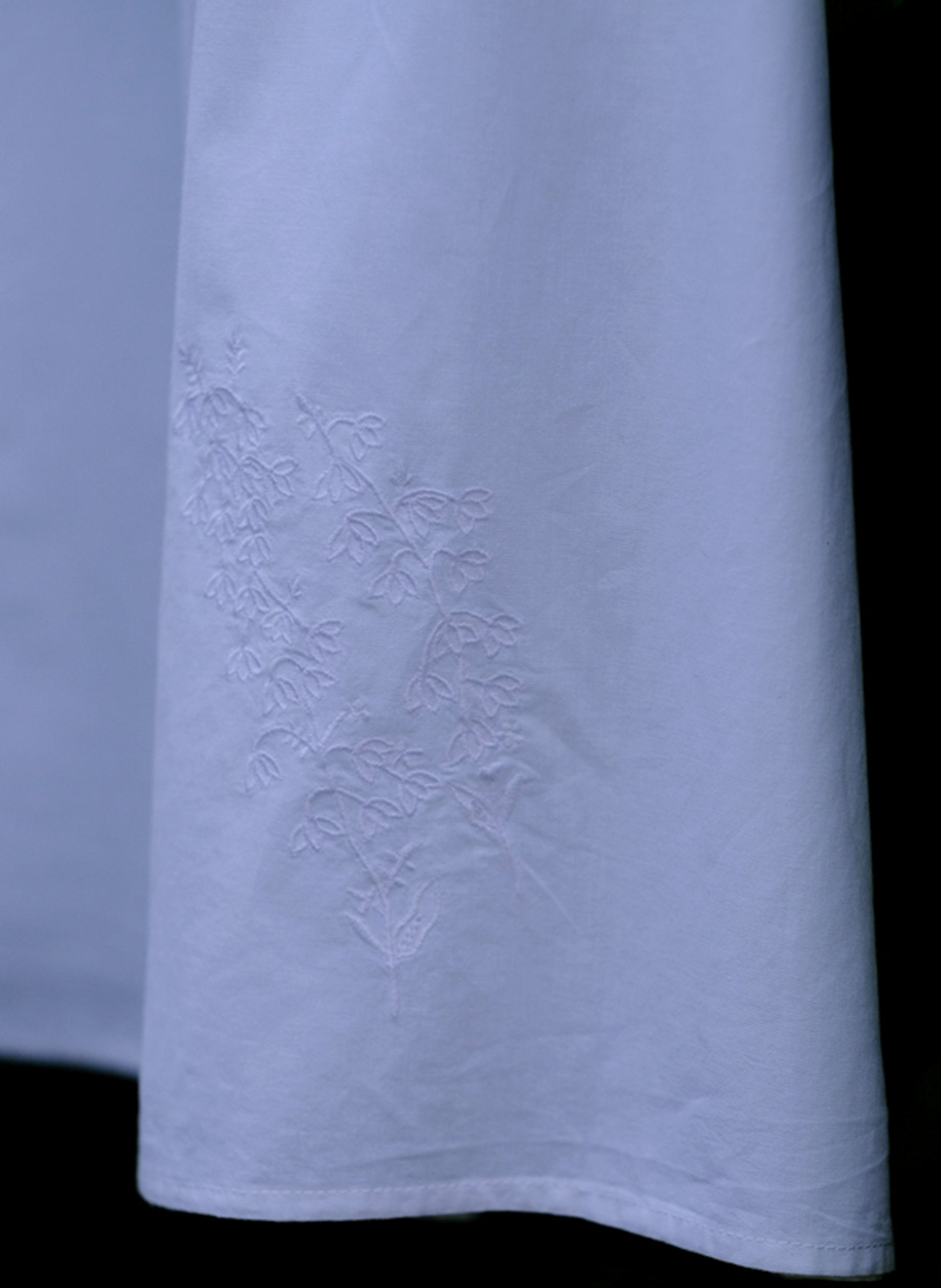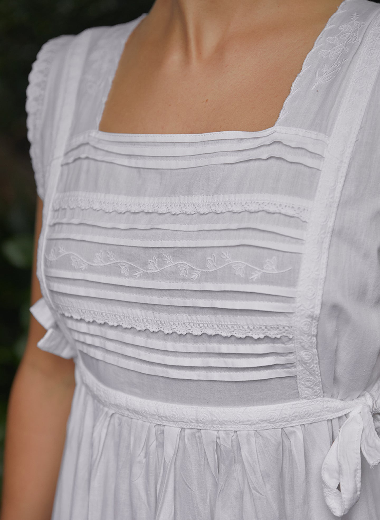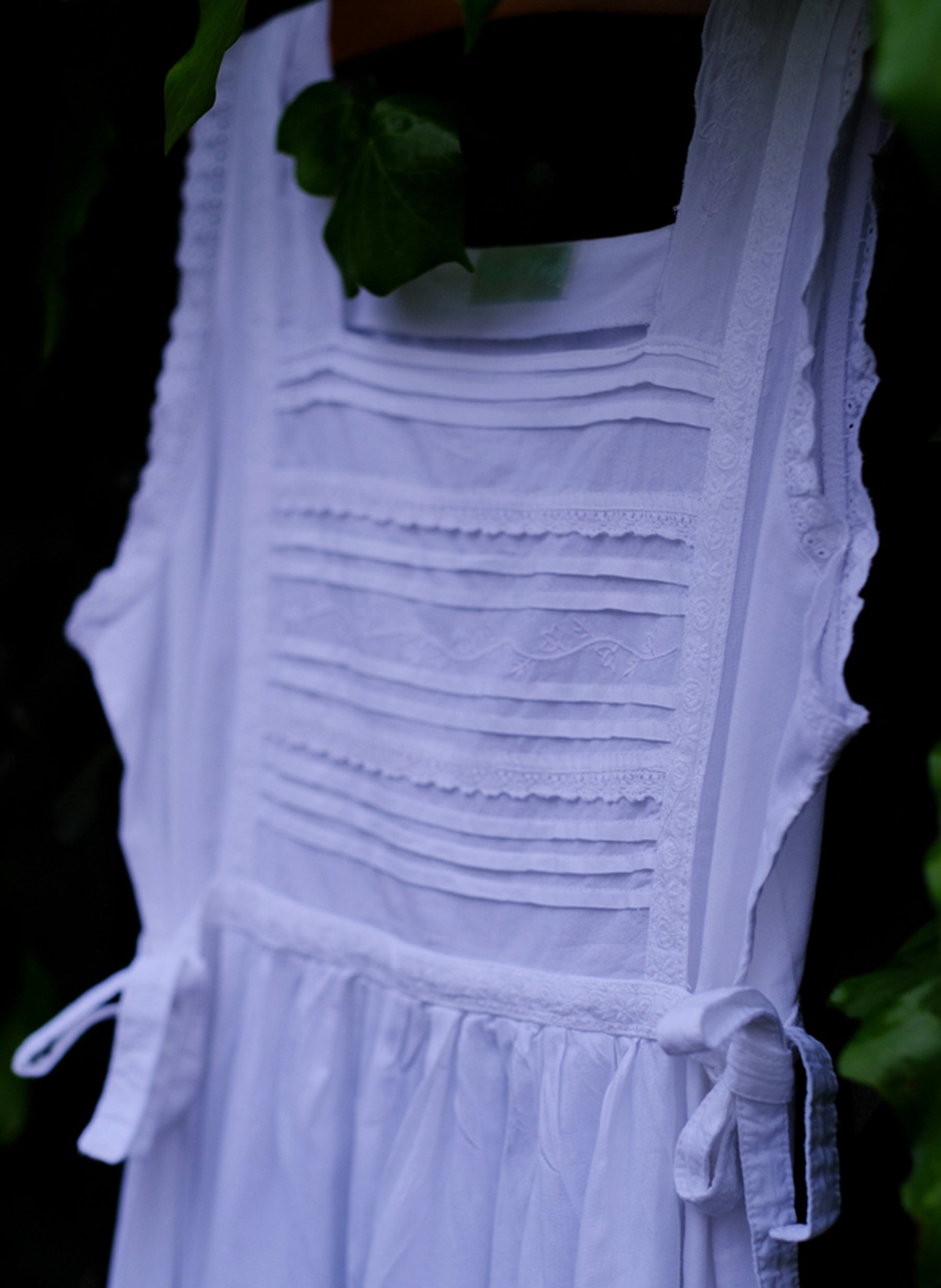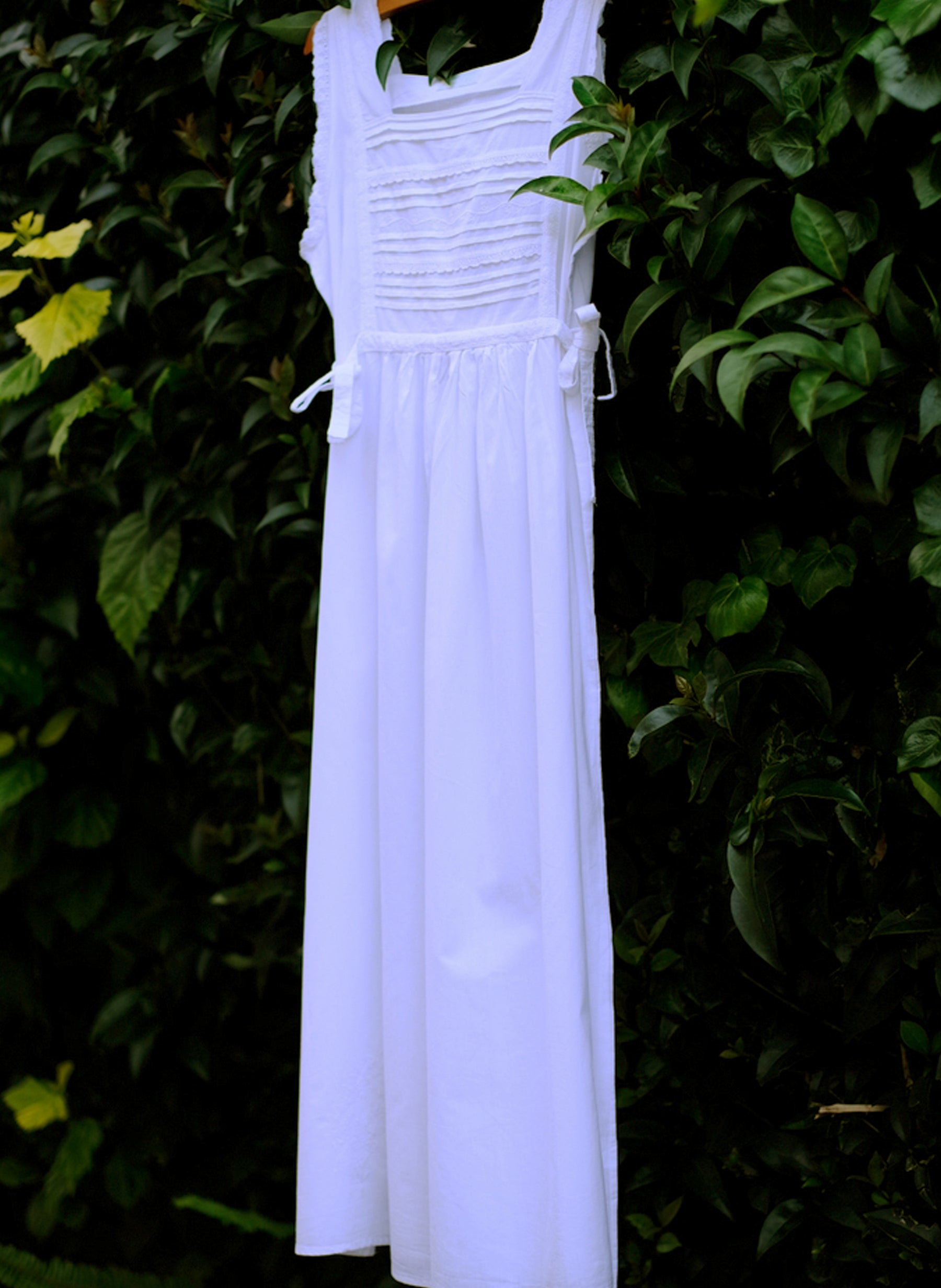 The Lily is a pinafore-style nightdress. A sleeveless full-length style with charming decorative side ties at the waist. Trimmed with rows of pintucks, lace and edged in broderie anglaise, this nightdress is pretty enough to wear during the day.