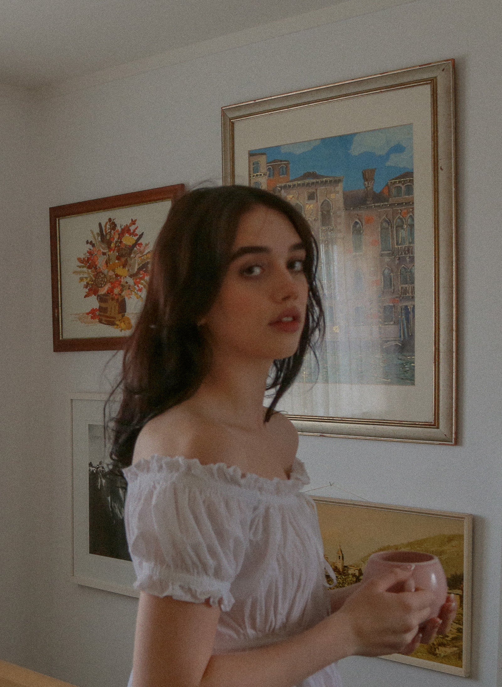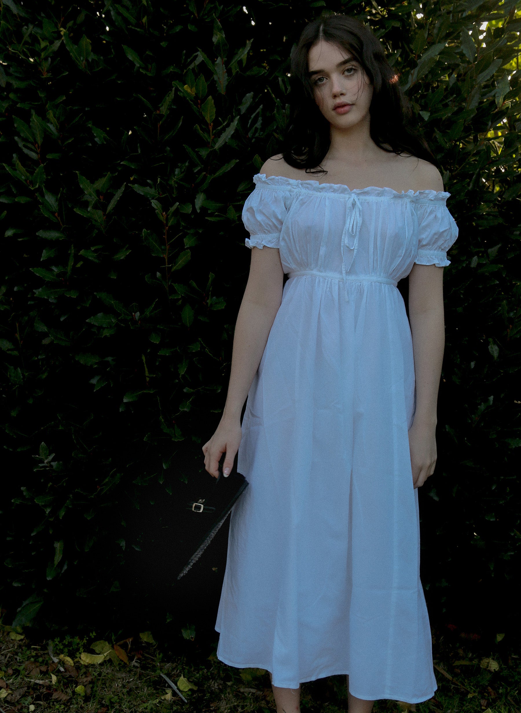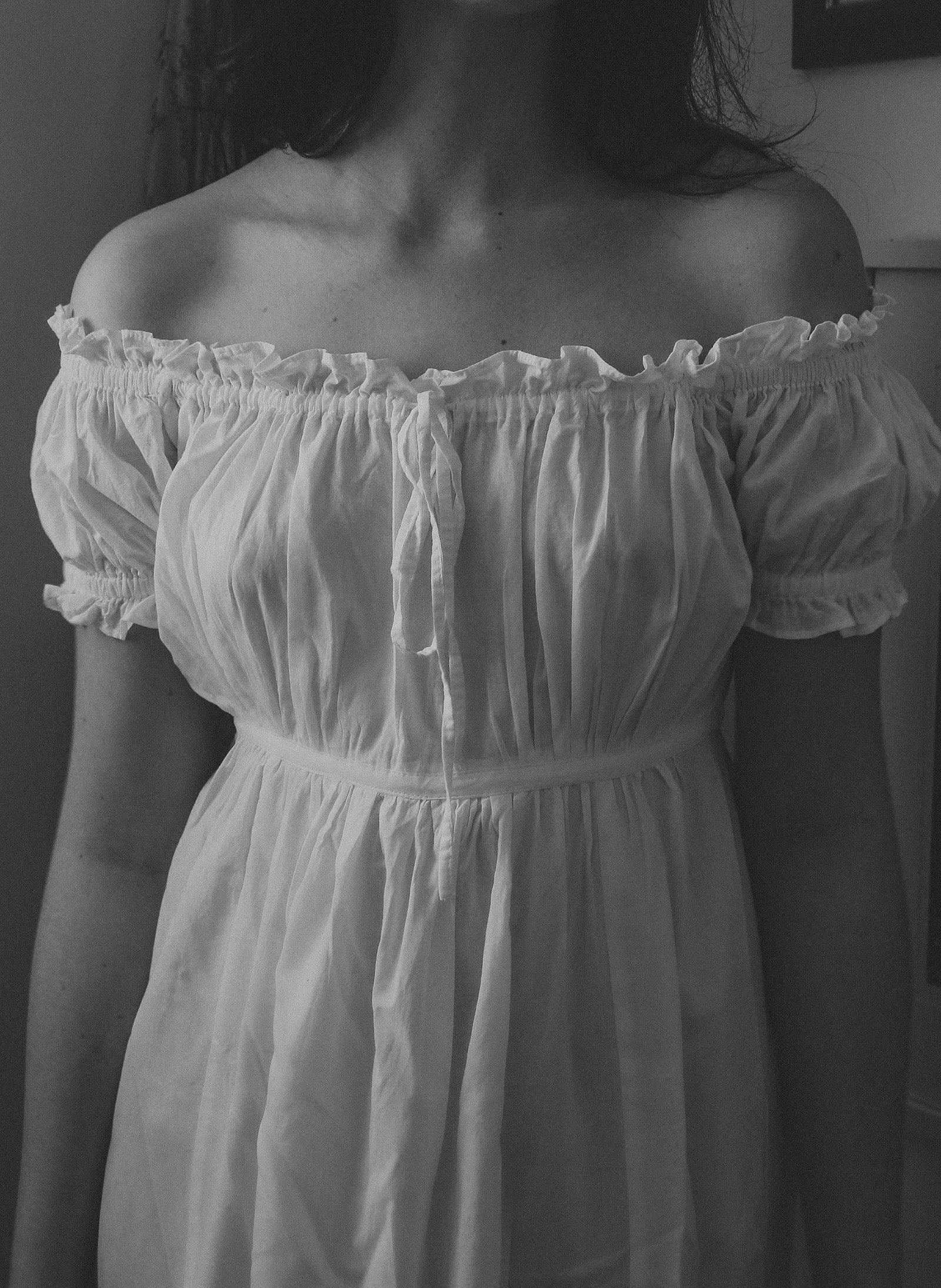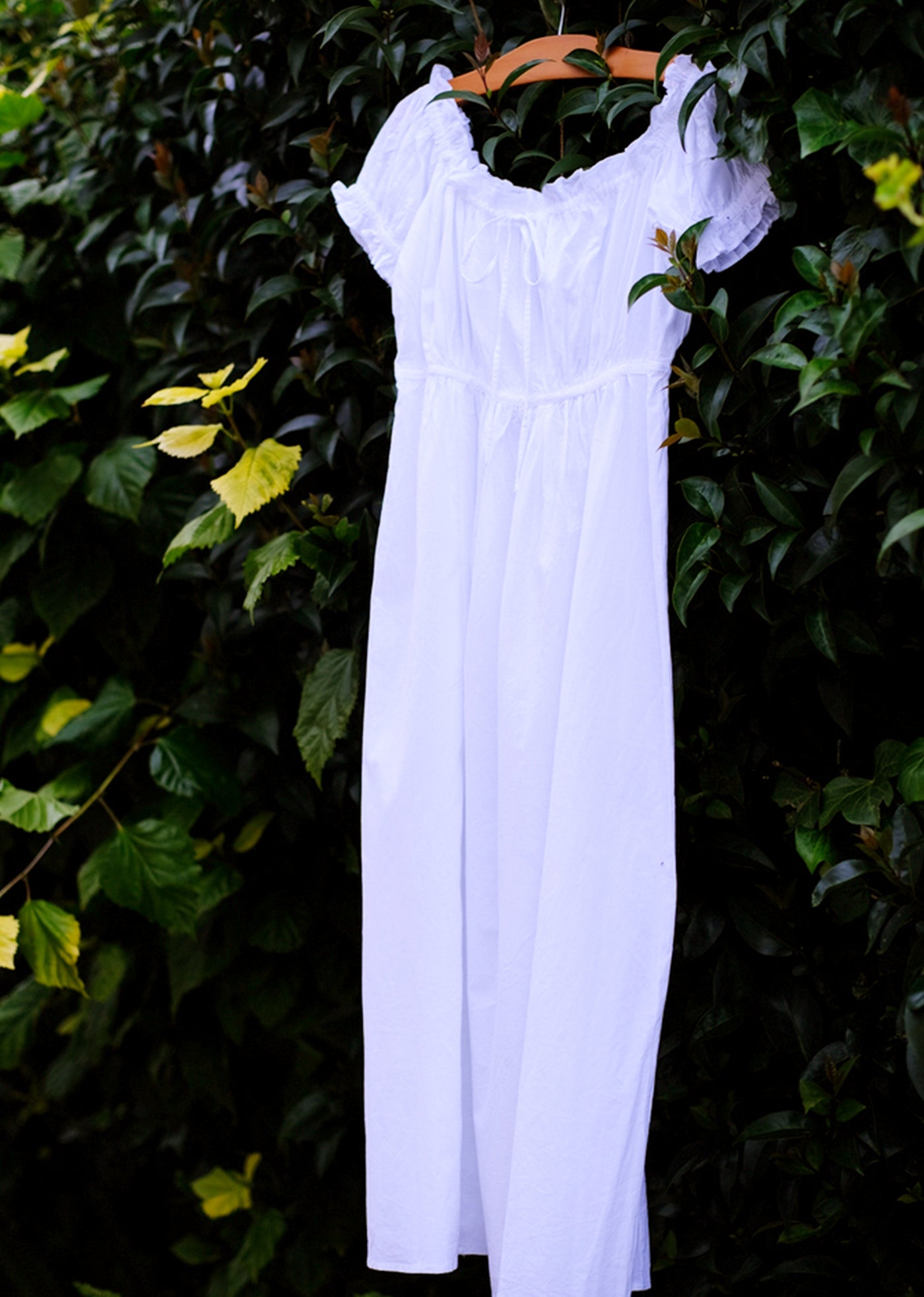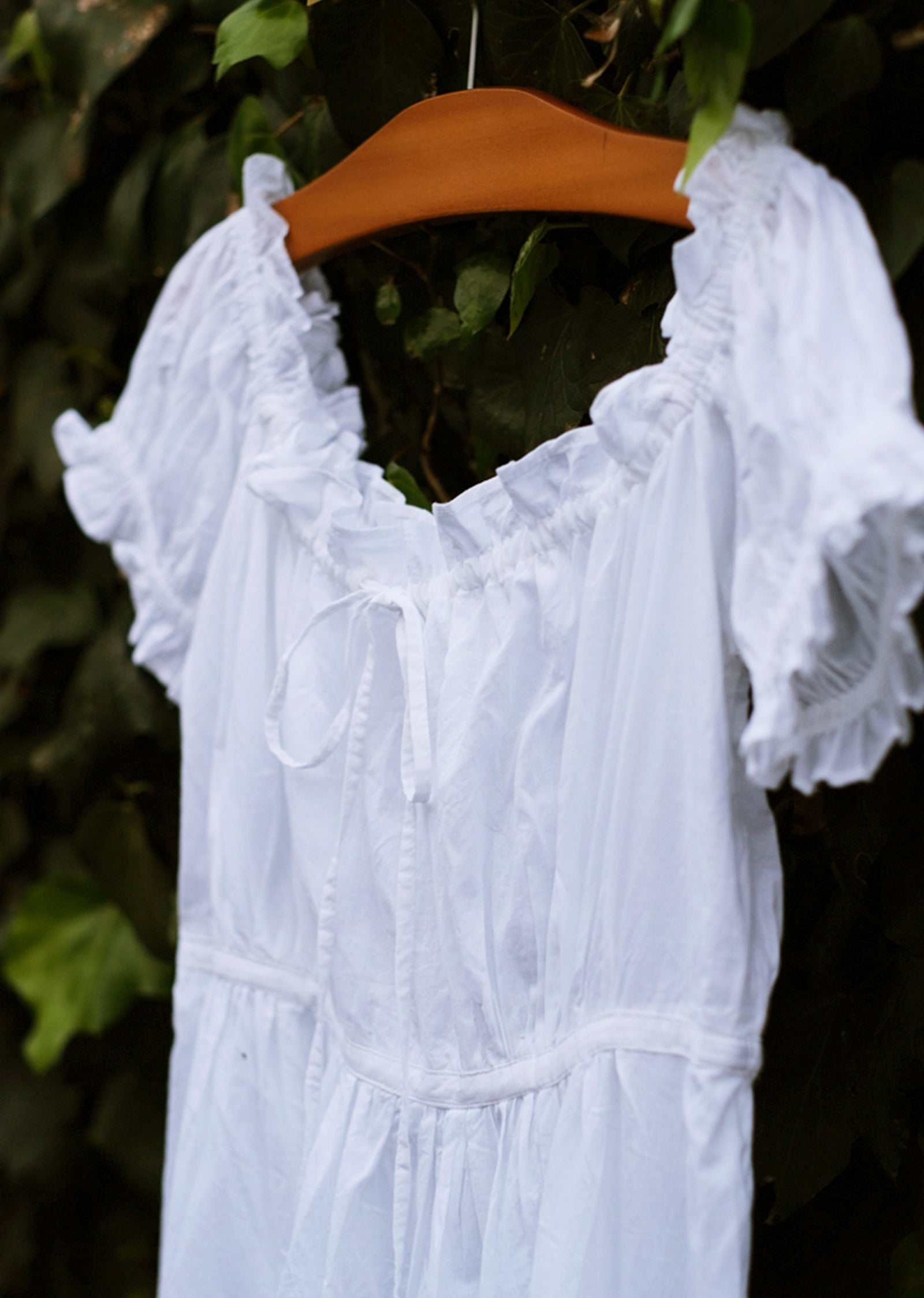 The Meadow is a romantic Regency-inspired nightdress with a ruffled neckline with drawstring tie, soft gathering, and short puff sleeves that can be worn on or off the shoulder. This full-length nightgown is made of very soft cotton and is generously cut allowing it a floaty diaphanous silhouette.