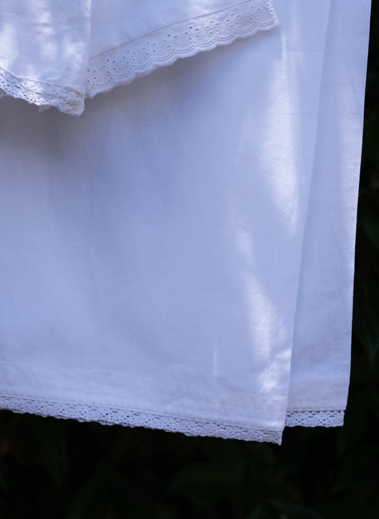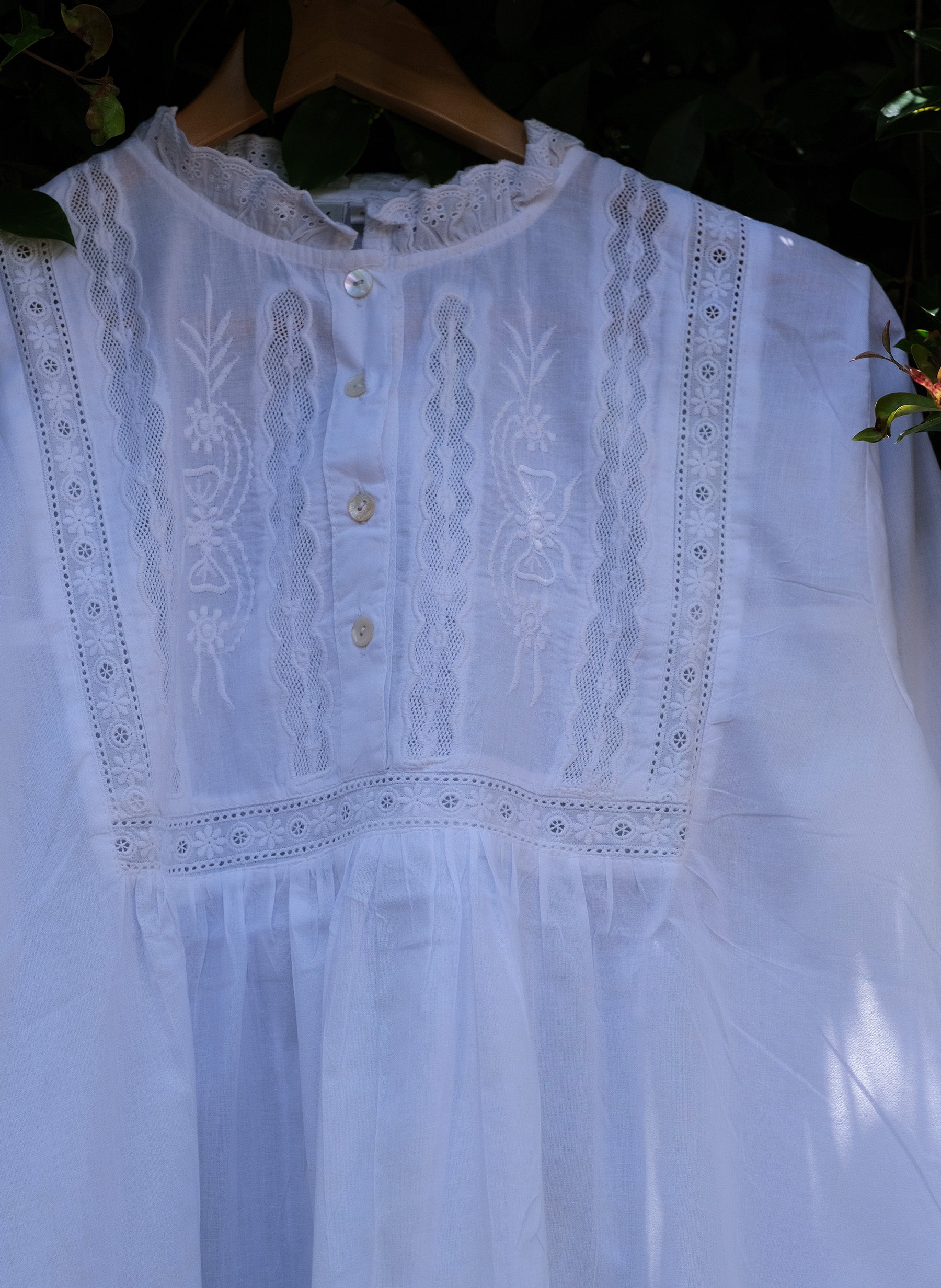 This long pyjama set is made from the softest Indian cotton and based on The Rose nightdress. The cotton blouse has delicate broderie anglaise details and long sleeves and is finished with lace inserts on the front panel and mother of pearl buttons. The pants are also trimmed with cotton lace and have a very comfortable elasticated waistband and adjustable drawstring.