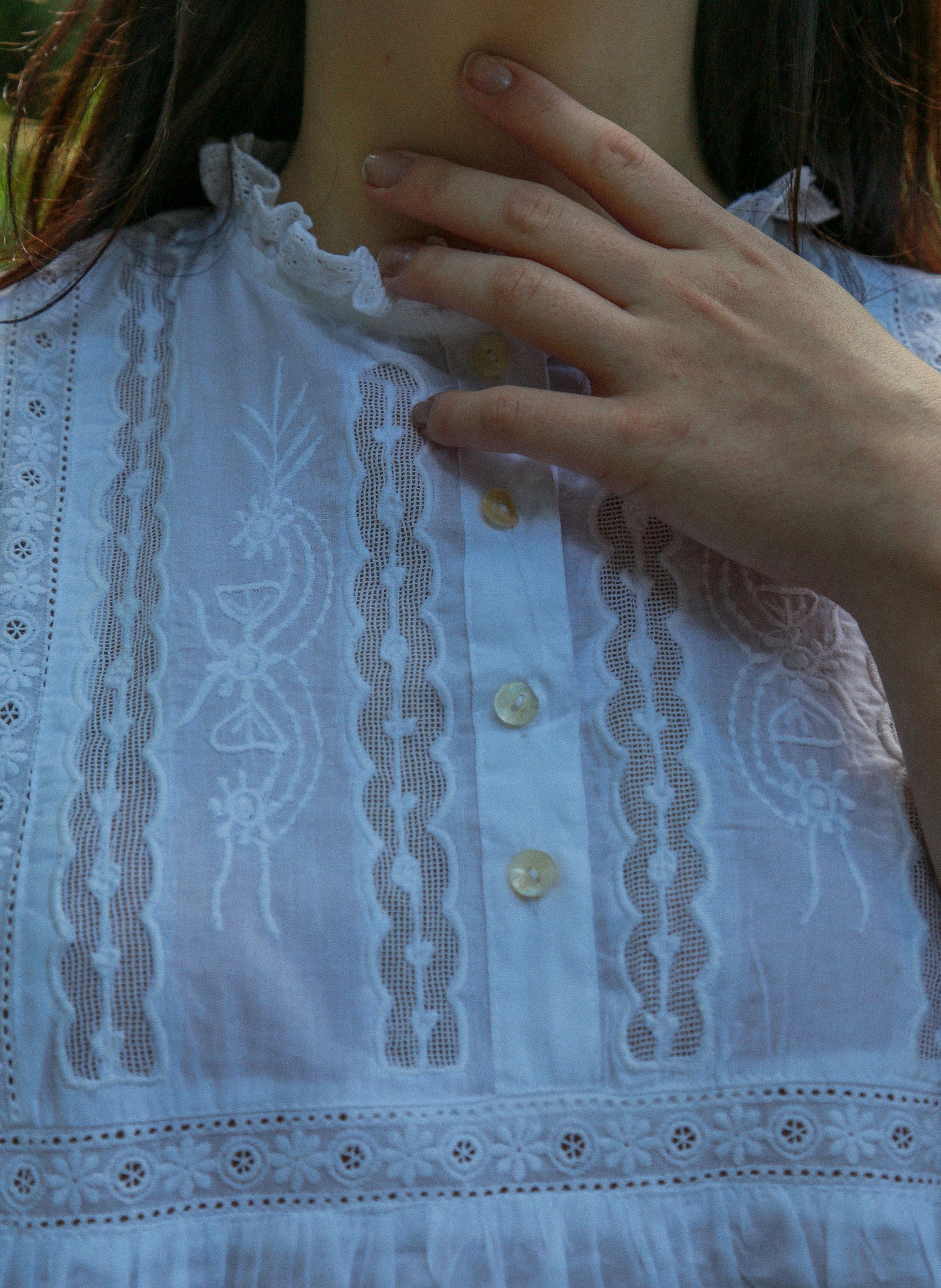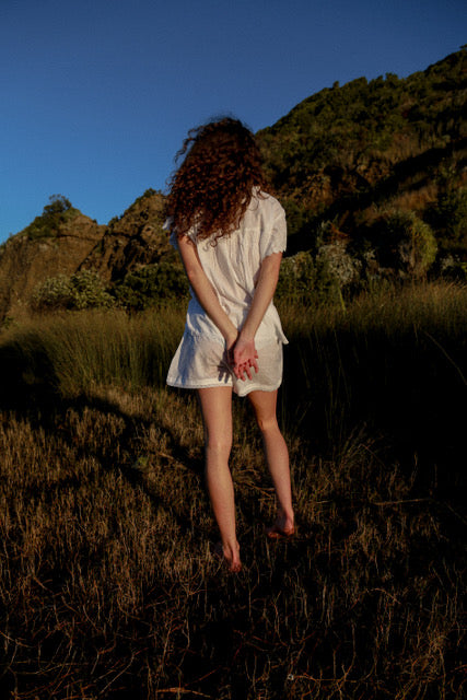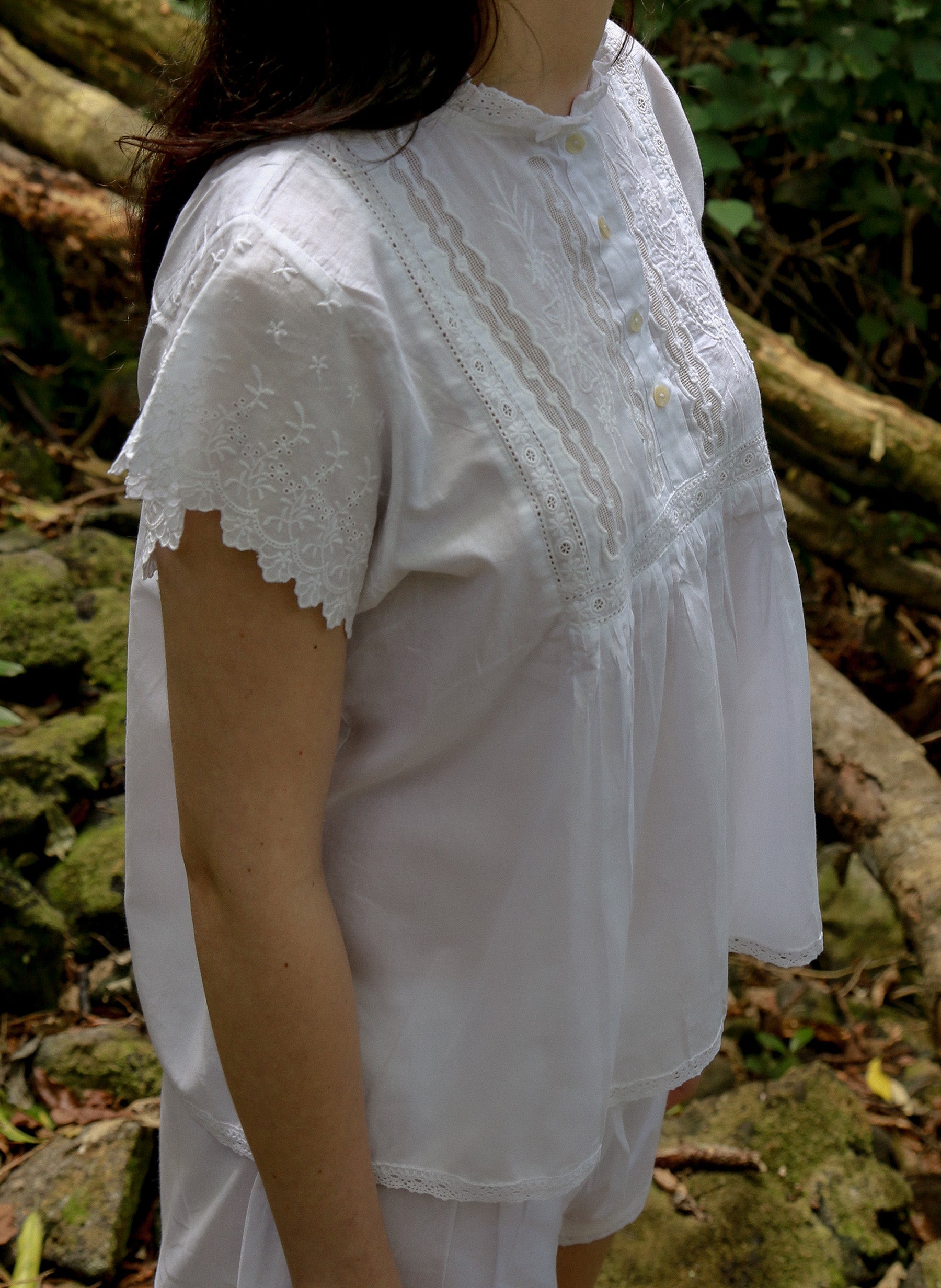 This short pyjama set is made from the softest Indian cotton and based on The Rose nightdress. The cotton blouse has delicate broderie anglaise details and cap sleeves and is finished with lace inserts on the front panel and mother of pearl buttons. The shorts are also trimmed with cotton lace and have a very comfortable elasticated waistband and adjustable drawstring.