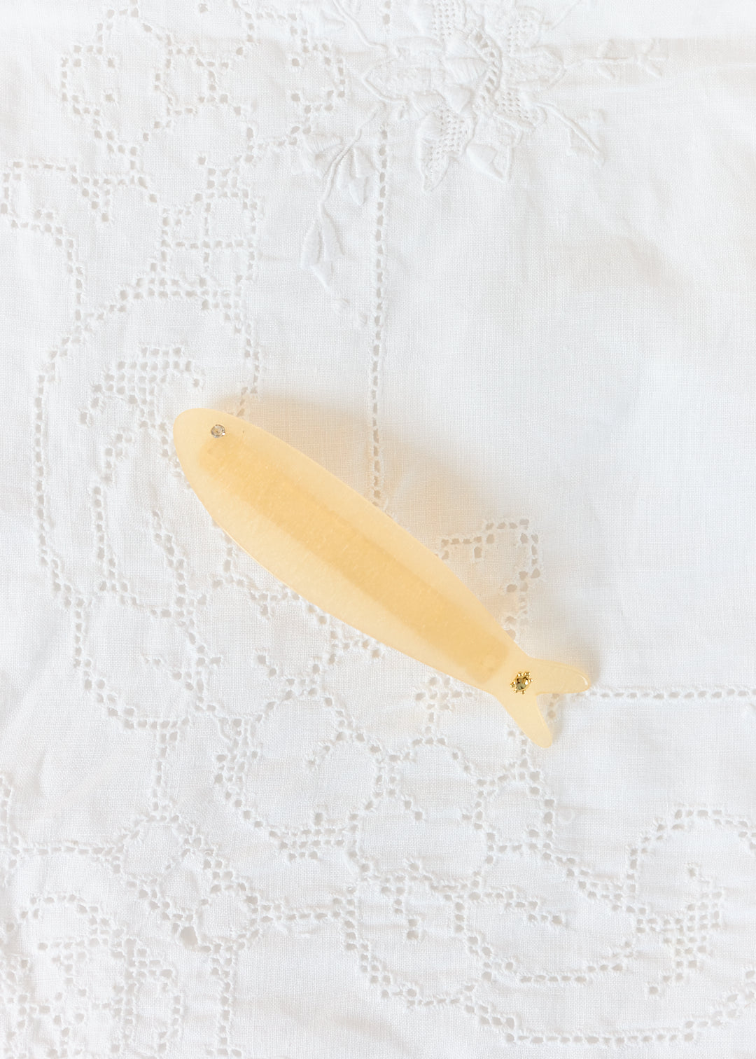 The Silky Sand Herring clip features a small Swarovski crystal eye and a gold plated nickle-free barrette mechanism.